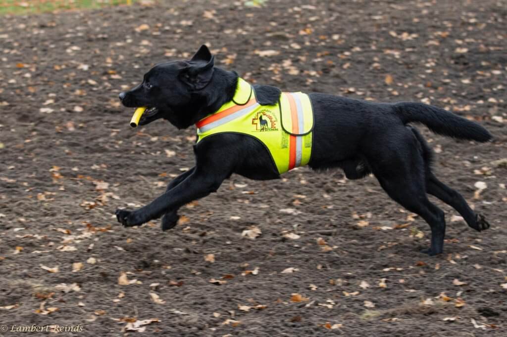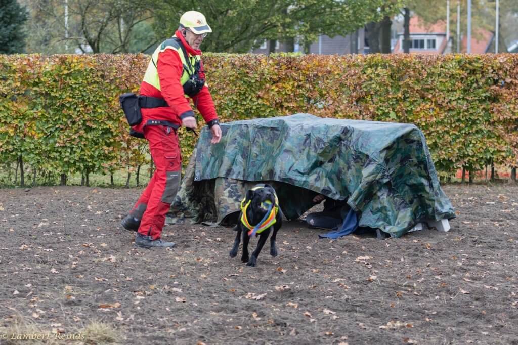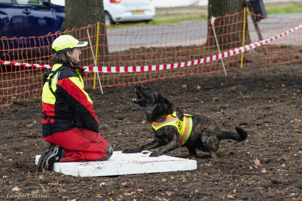 Bij de demo lag de nadruk op hoe wij het verwijzen aanleren. Hoe geven honden aan dat ze een vermiste hebben gevonden? We lieten zien dat sommige honden dat blaffend doen en dat andere bringselen. En natuurlijk waren er toeschouwers die weleens als oefenslachtoffer wilden ervaren hoe het is om gevonden te worden door een hond.