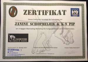 In het weekend van 20 tot 22 oktober heeft ons mantrailteam Janine met haar hond Pip deelgenomen aan het GAK9 Mantrail Seminar te Dortmund.